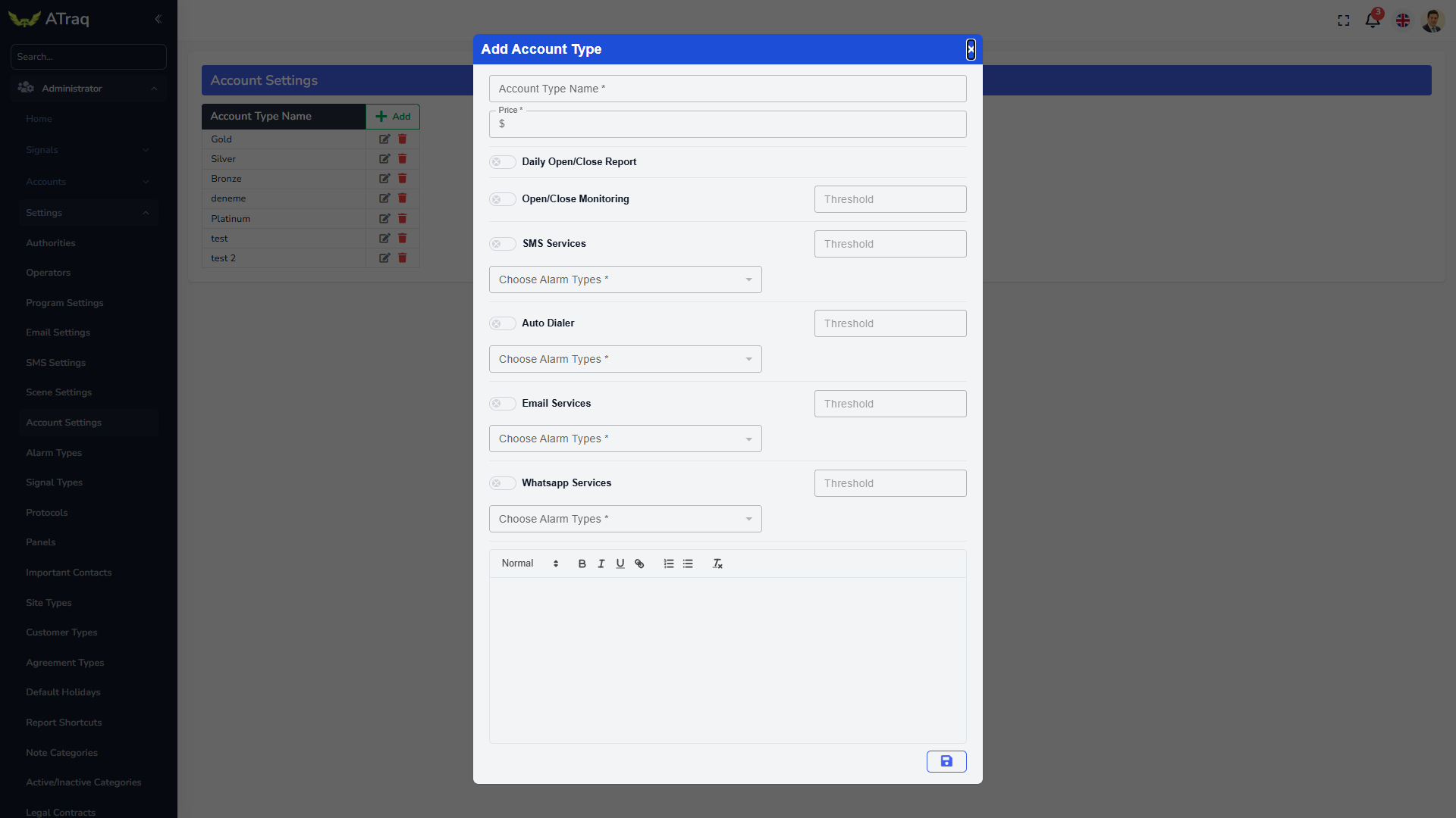 If you would like for that account type to send SMS messages, activate it by clicking on the slider, choose for which alarm types you would like for the SMS messages to be sent through and the threshold for this account type. So you could say that you will send only 100 SMS messages to a customer using this Account Type per month.